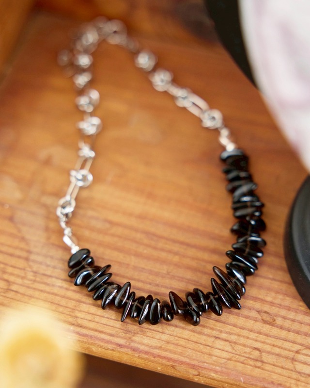 Noir Chain Heart(ノワール・チェーン・ハート) Noir=フランス語で「黒」。 モードでクールな印象を纏いながら、心に寄り添うハートが揺れるデザイン。 大人のハンサムネックレス。 スモーキークォーツの自然なサザレを美しく連ねた部分には、 どこかアンニュイな色気と深みを。 反対側は、ステンレスチェーンがクールな輝きを響かせて、 “強さと美しさの二面性”を表現するよう。 艶のあるハート型のシルバー・ヘマタイトが可愛い。 そしてエンドには、さりげなく揺れる黒蝶貝のハート。 甘すぎないのに、女らしさと個性はしっかりキープ。 手持ちのシンプルな服も、これひとつで一気にハンサムでハッピーな気持ちへ昇華します。 長さは37~42cmでアジャスター調節可能。 首元に添いながらも、スタイリングを選ばない絶妙なバランスの一点物です。 【使用石・意味合い】 スモーキークォーツ...不安やネガティブを取りはらい心の安定をもたらす“癒し”の石。感情のデトックス。精神安定、不安や恐怖の解消、トラウマをなくす、安眠の御守り。邪気をはらう、地に足をつける、自分を知れる、ひらめきがわく、愛を次のステージにアップさせる。 ヘマタイト...勝利へ導く石、積極的に行動することを助ける、困難を乗り越えて目標達成へと導いてくれる、マイナスのエネルギーを取り去る、ネガティブをポジティブに、他人への影響を受けやすい人におすすめ、恋のライバルに勝つ、周囲を引っ張っていく強さと優しさを発揮自分に自信がもてない人をサポート、心身のエネルギーを活性化する、バランスを整えてくれる、身代わり石、厄除け 黒蝶貝:女性らしい直感と美しさを引き出すパワーを持ち、心を穏やかに整える 【サイズ】 長さは37~42cmで調節可能。 【ハンドメイドに関して】 Butterfly Stone の商品はハンドメイドのアクセサリーです。また使用しているものは天然の鉱物になります。最新の注意を払って製作していますが無理な力が加わると壊れてしまいますのでご注意ください。また到着より1週間以内の故障に関しましてのみ無料にてrepairを承っております。それ以降のお修理に関しましても有料にて承っておりますのでお気軽にご相談くださいませ。 【発送前の浄化に関して】 Butterfly Stoneでは「持つ人が幸せになりますように」と祈りを込めながら全ての石をセージの煙で浄化し、梱包時に浄化スプレーをかけて発送しています。 【天然石について】 天然石は自然由来のため、水分・汗・太陽光・紫外線などの影響により、変色や経年による風合いの変化が生じることがあります。 これは避けることが難しい天然素材ならではの特性ですので、あらかじめご理解いただけますと幸いです。 また、なるべく高温・多湿・直射日光を避けてご使用・保管いただくことで、より長く美しい状態を保つことができます。 【ラッピングに関して】 8,000円以上の商品は、白箱にお入れして発送いたします。 8,000円未満の商品は、ご自宅用のラッピングでお届けいたしますが、すべてに持ち運びに便利な巾着が付きます。 ※8,000円未満の商品でも、プレゼント用の白箱をご希望の場合は、 ご購入時に「ボックス包装オプション(有料)」をご選択くださいませ。