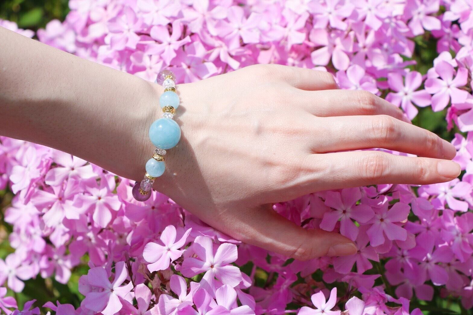 ハイクオリティのミルキーアクアマリン大小をふんだんにちりばめた天然石ブレスレット。