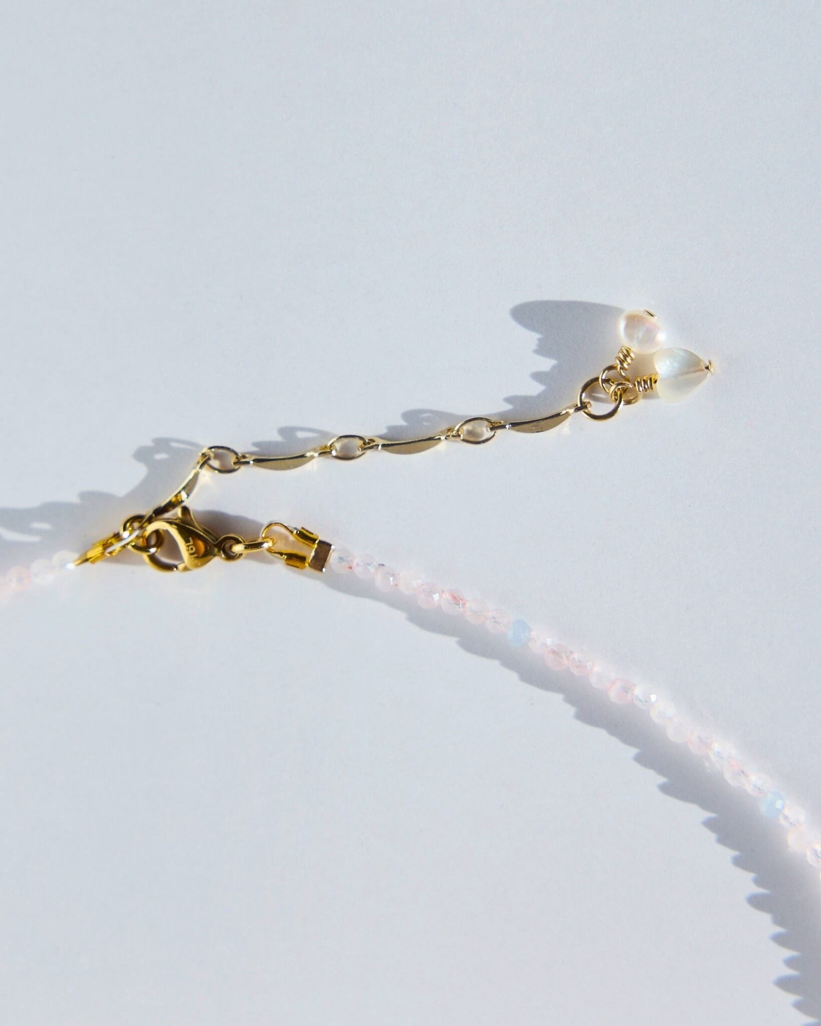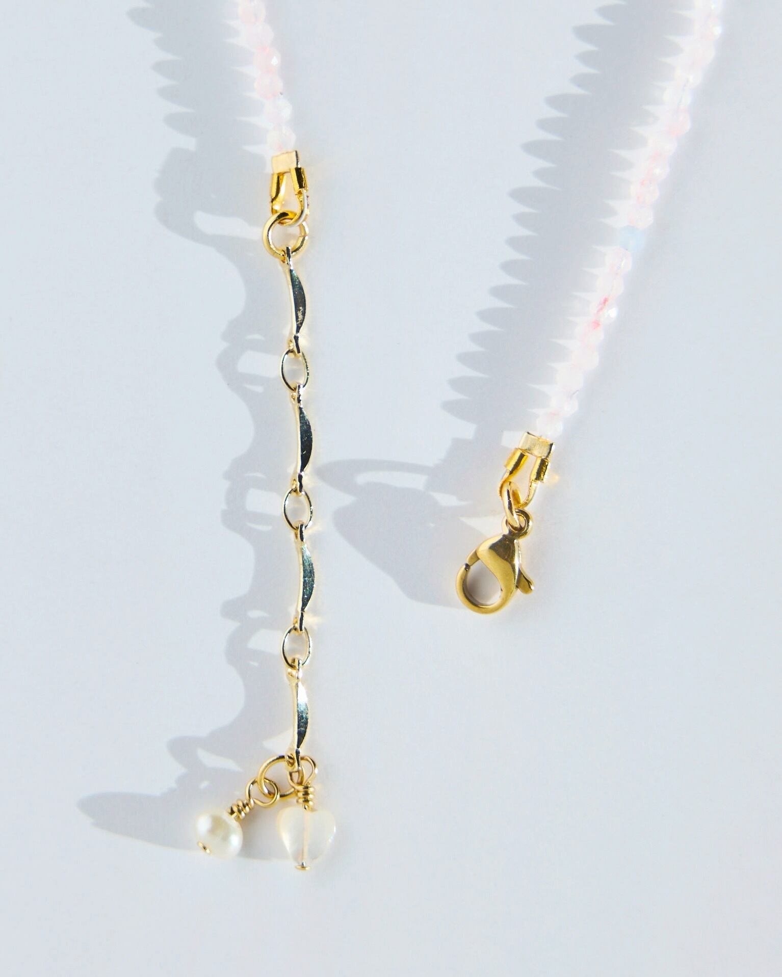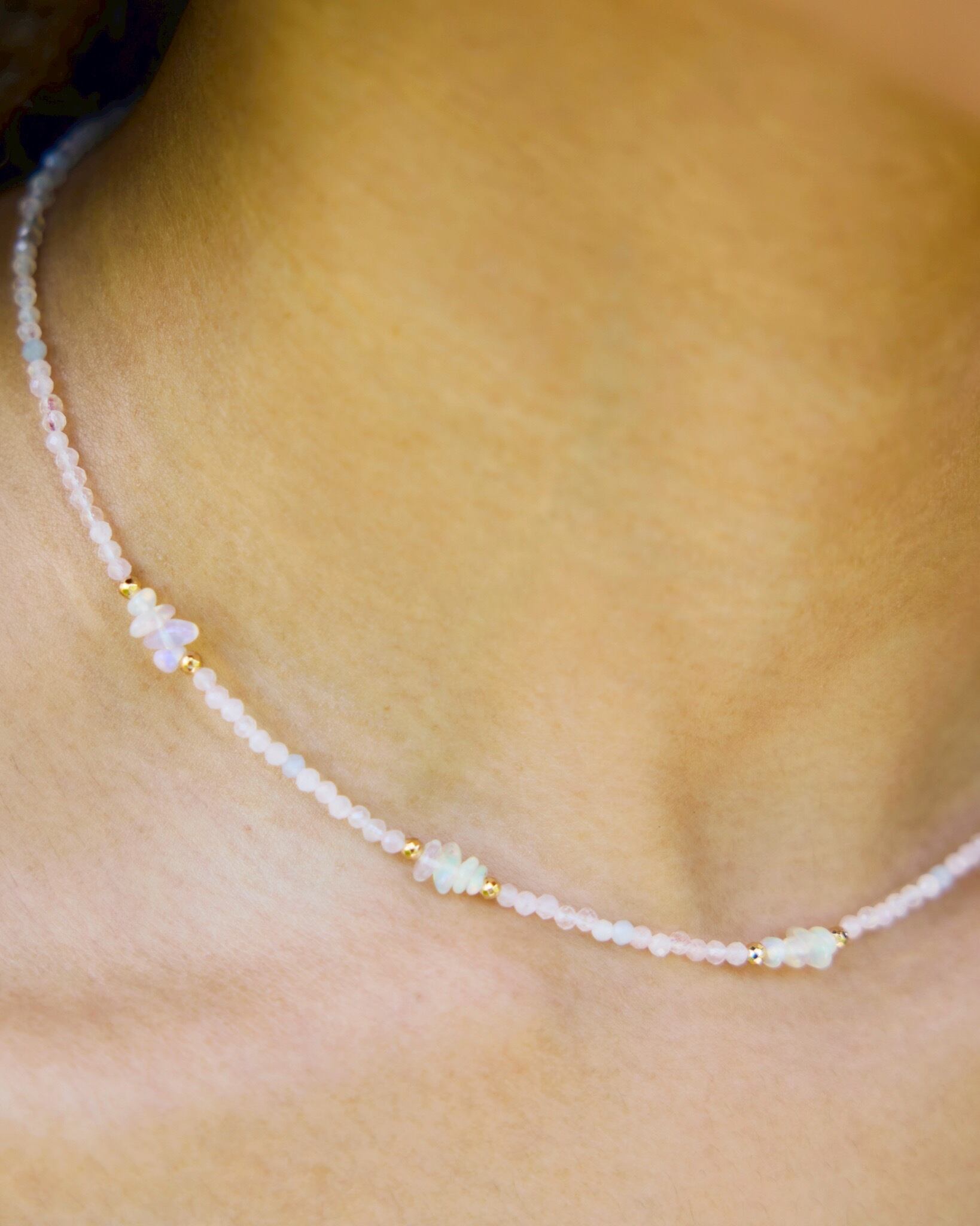 繊細にカットされた極小ローズクォーツを中心に据えた、細身で上品なネックレス。