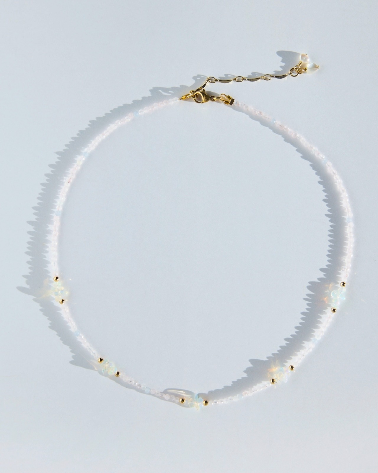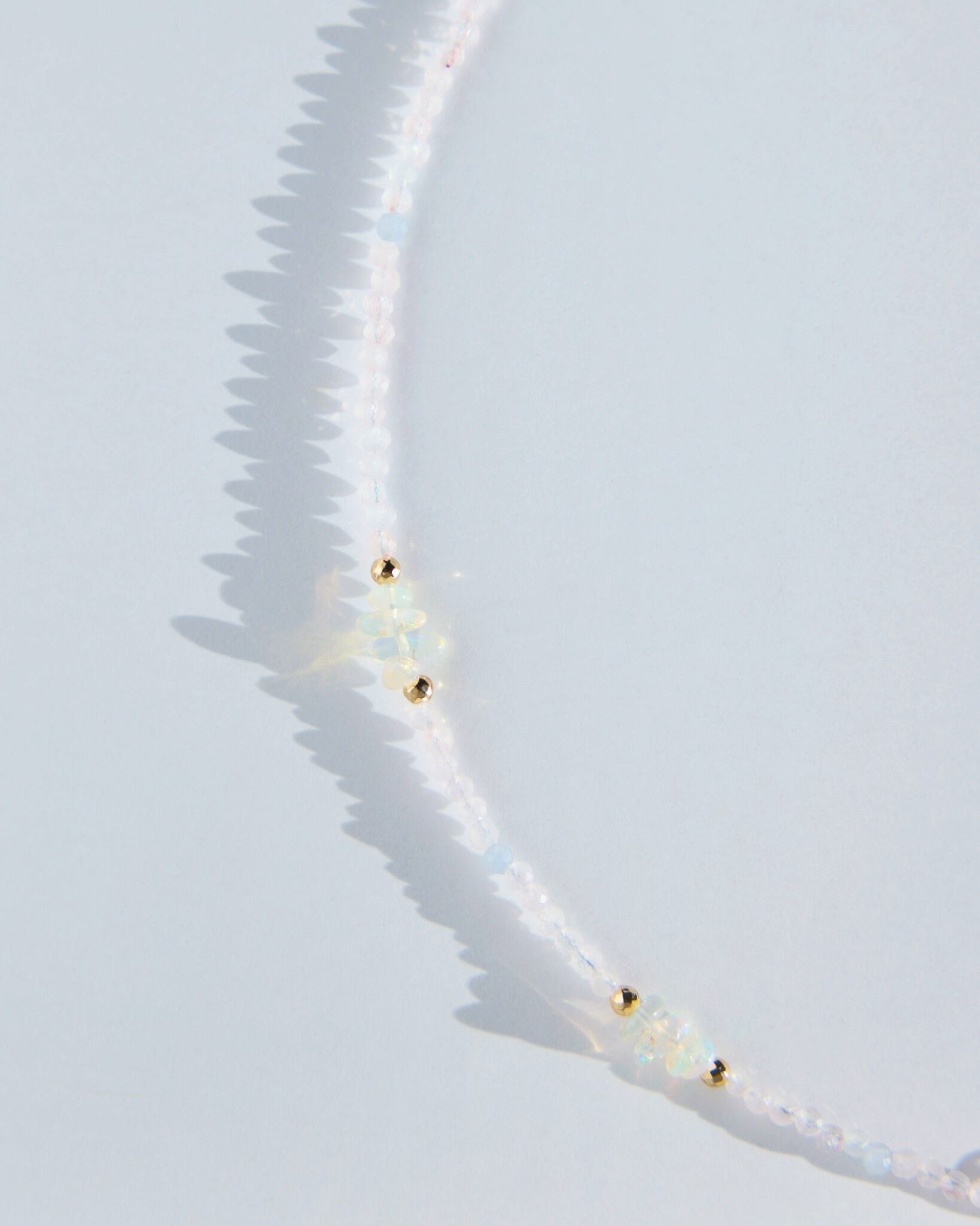 オパールのさざれが、光の角度によって表情を変える遊色の輝きで日常にさりげない煌めきを添えます。自分らしさを肯定し、創造性を高めてくれるパワーを秘めています。