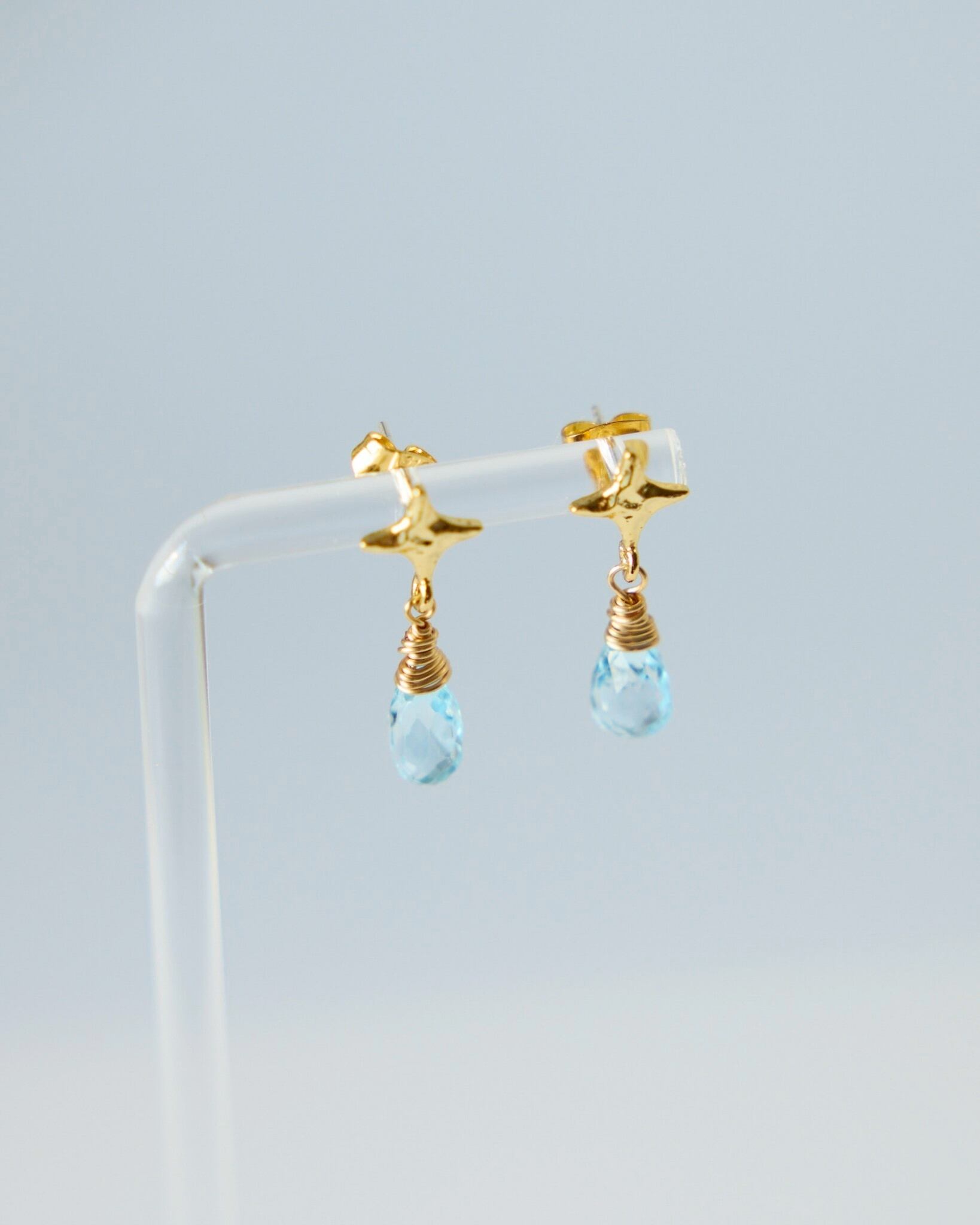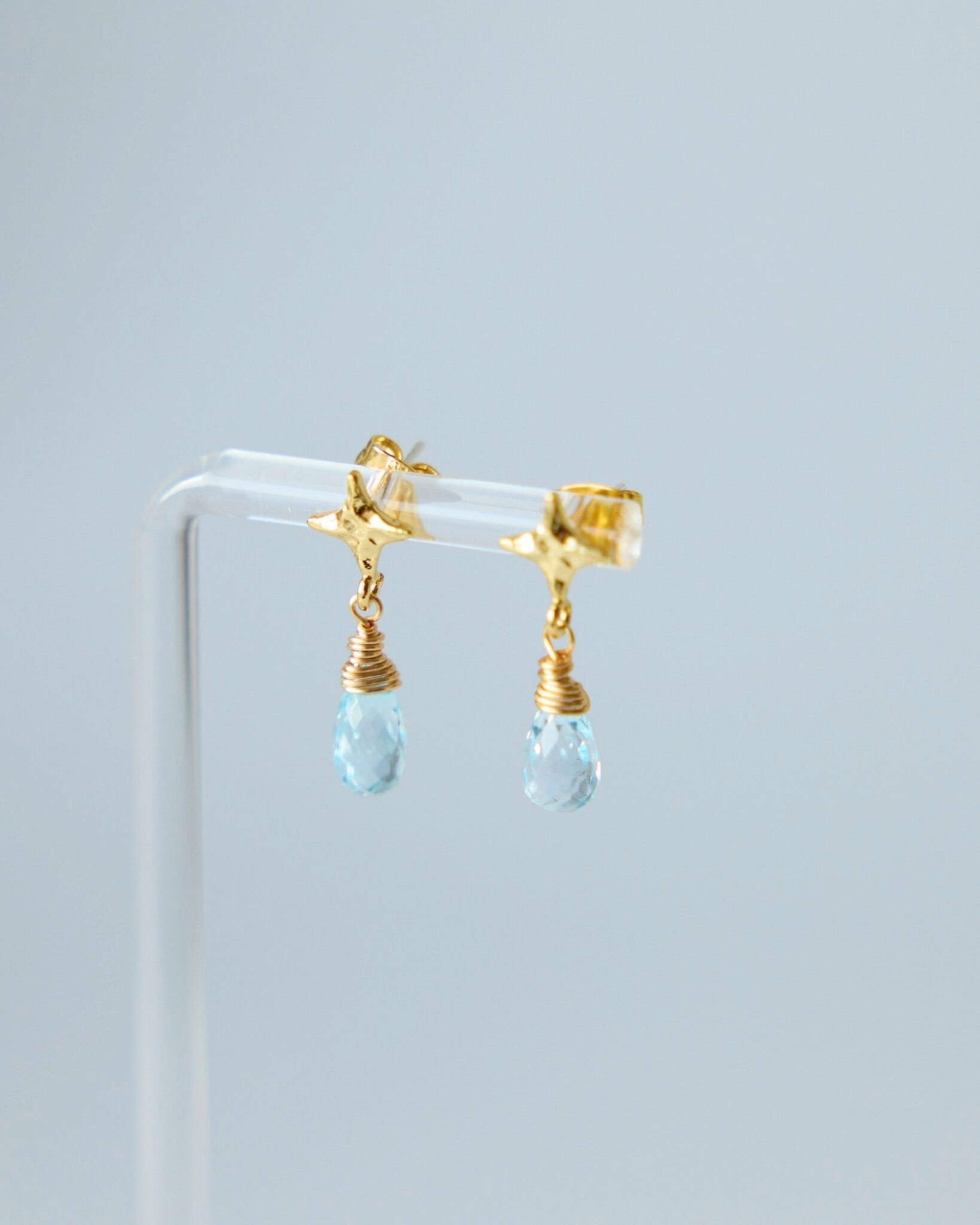 カットが施されたスカイブルートパーズが主役のゆらゆらピアス。