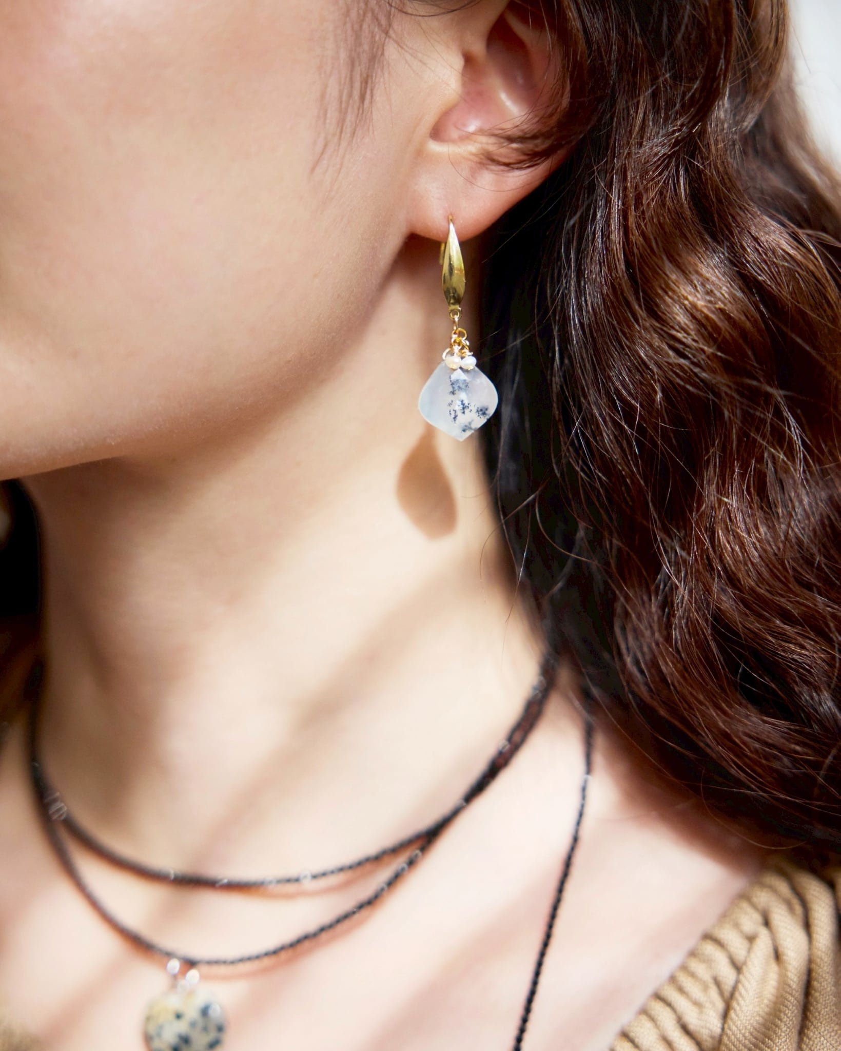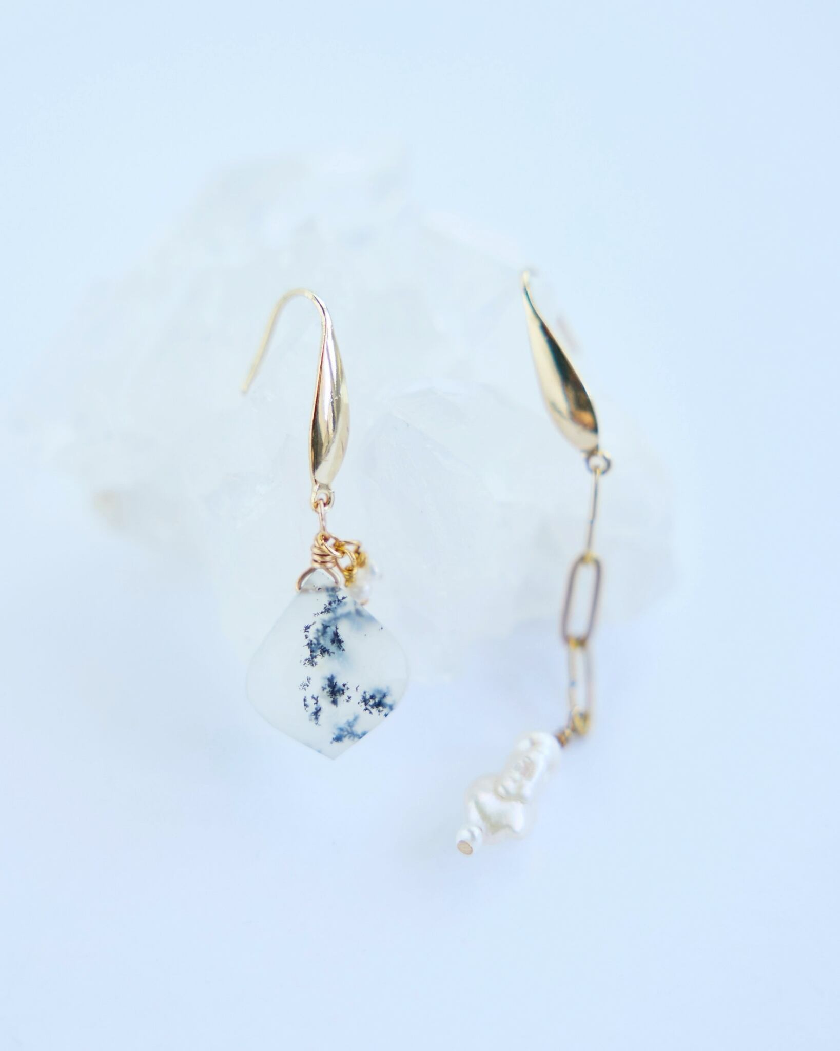 片側には樹木の枝のような模様が浮かぶデンドライトオパールを、もう片側には柔らかな艶めきを放つ淡水パールを。