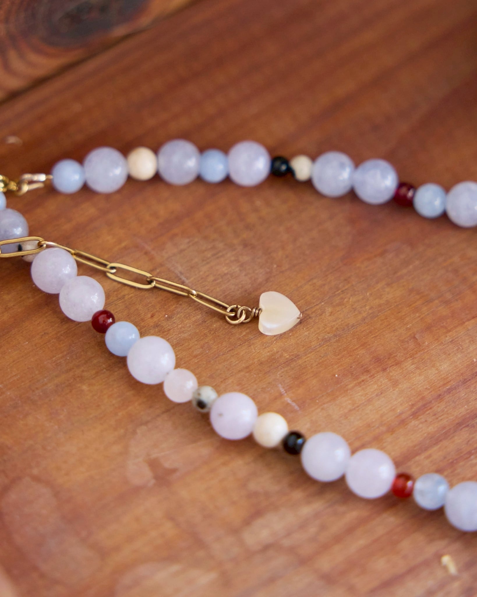 留め具のチェーンにはホワイトシェルのハートがやさしく揺れます。