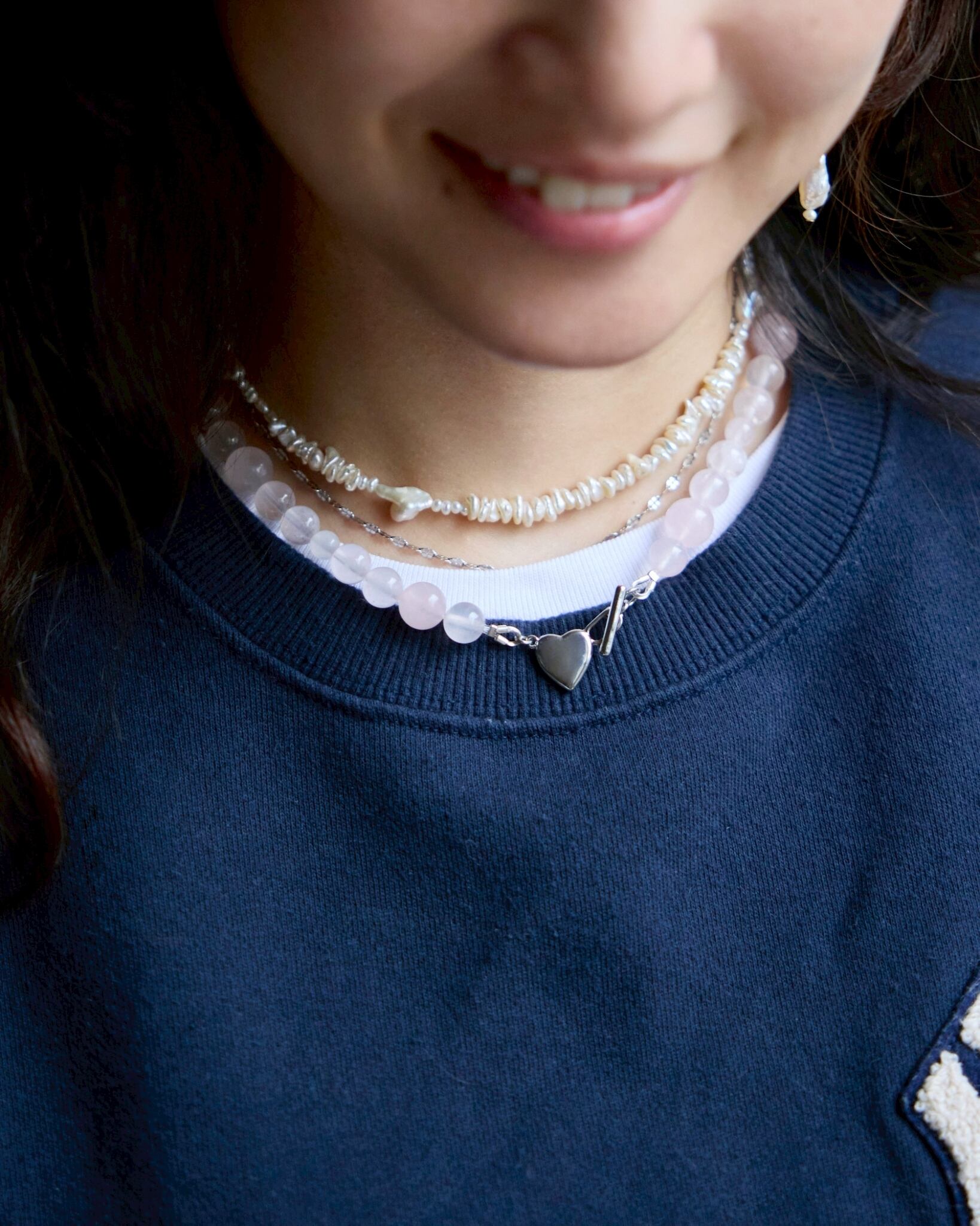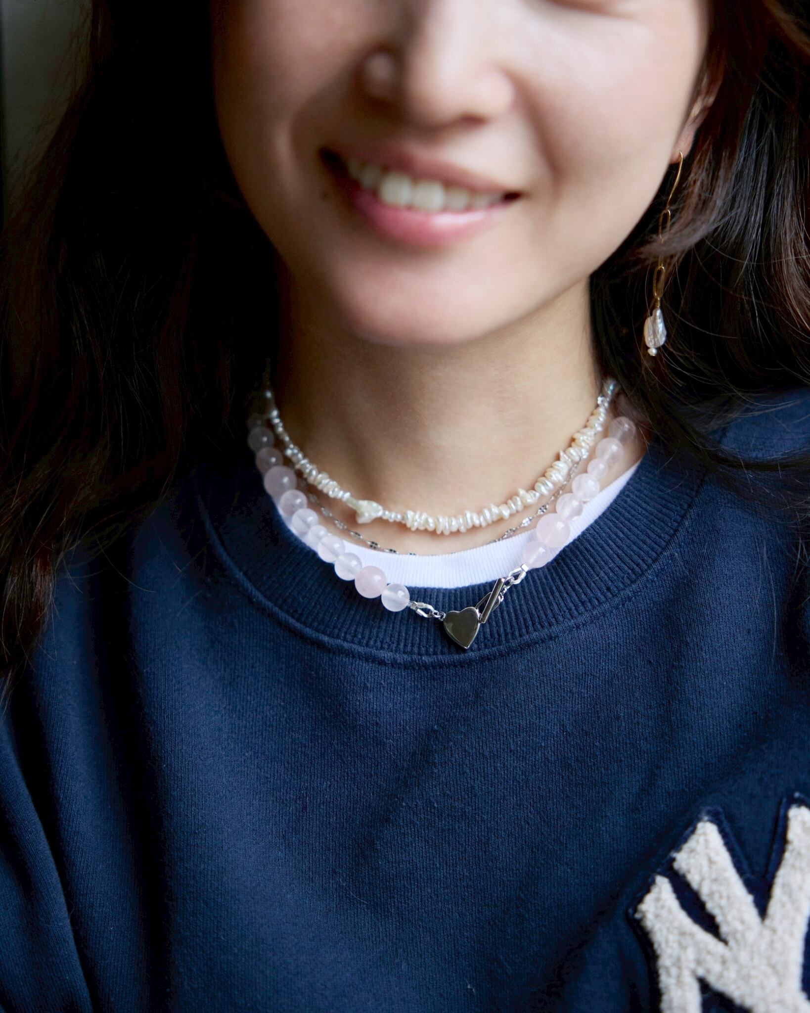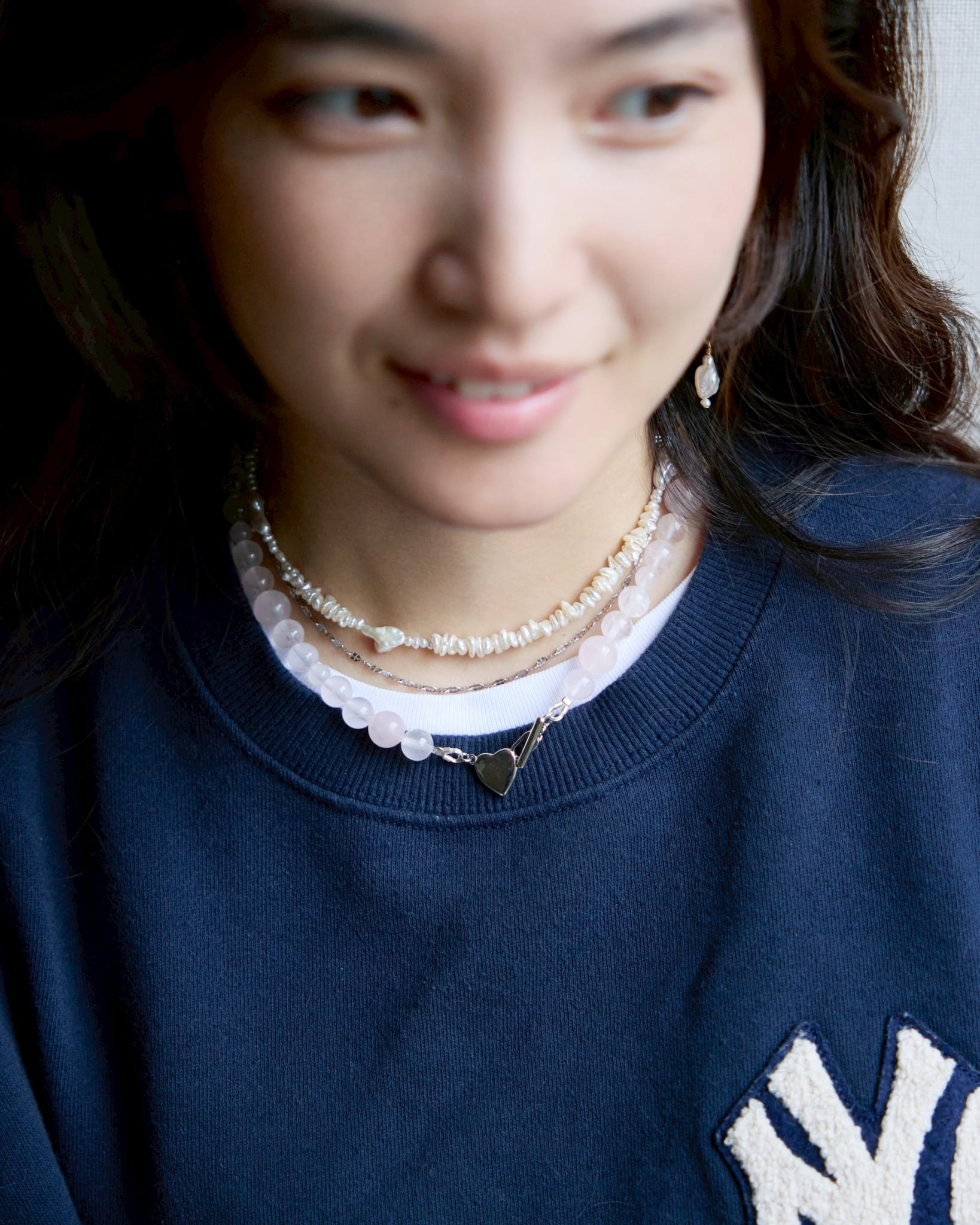 40cmのショートレングスで、どんな装いにも寄り添い、デコルテに淡い光をまとわせます。