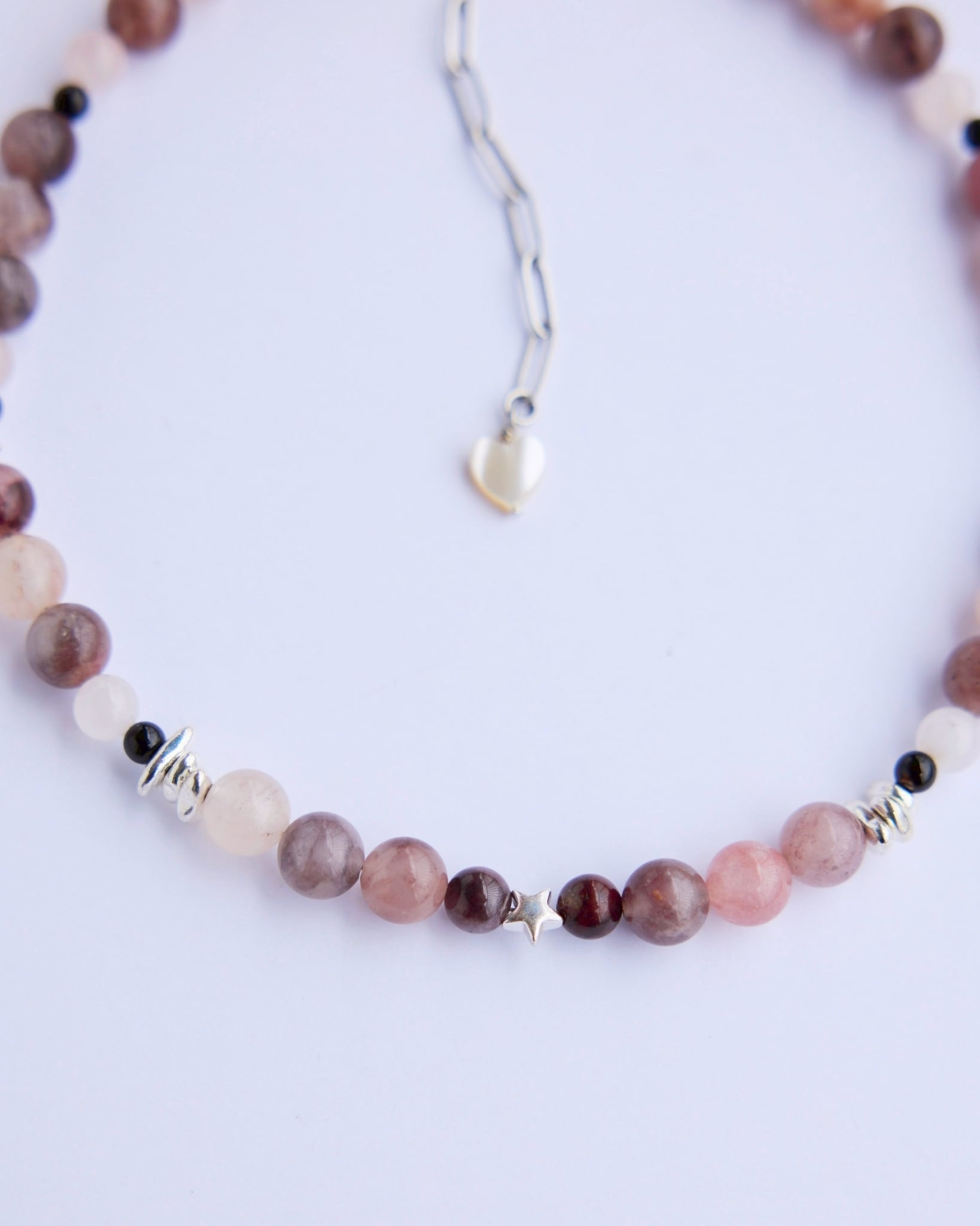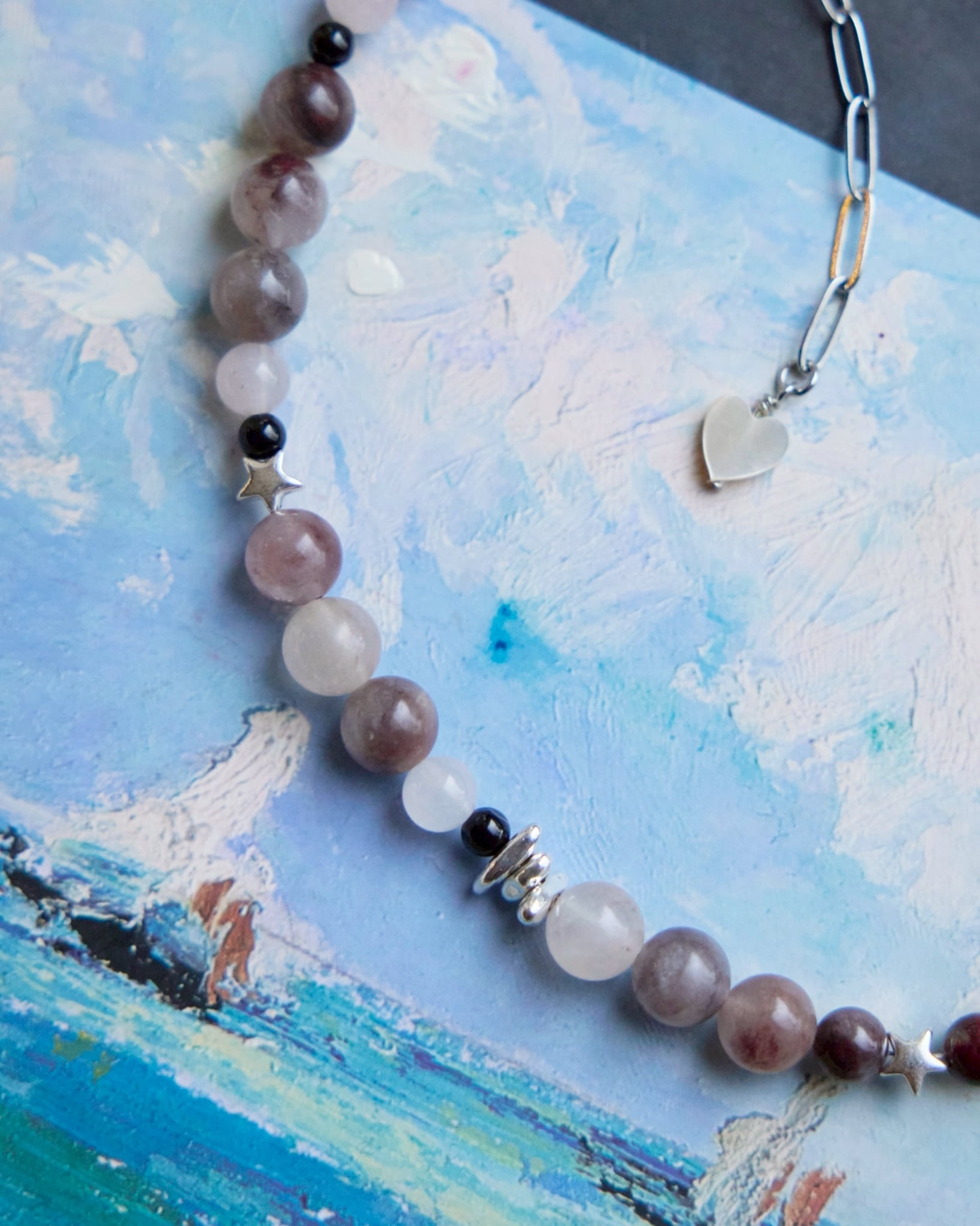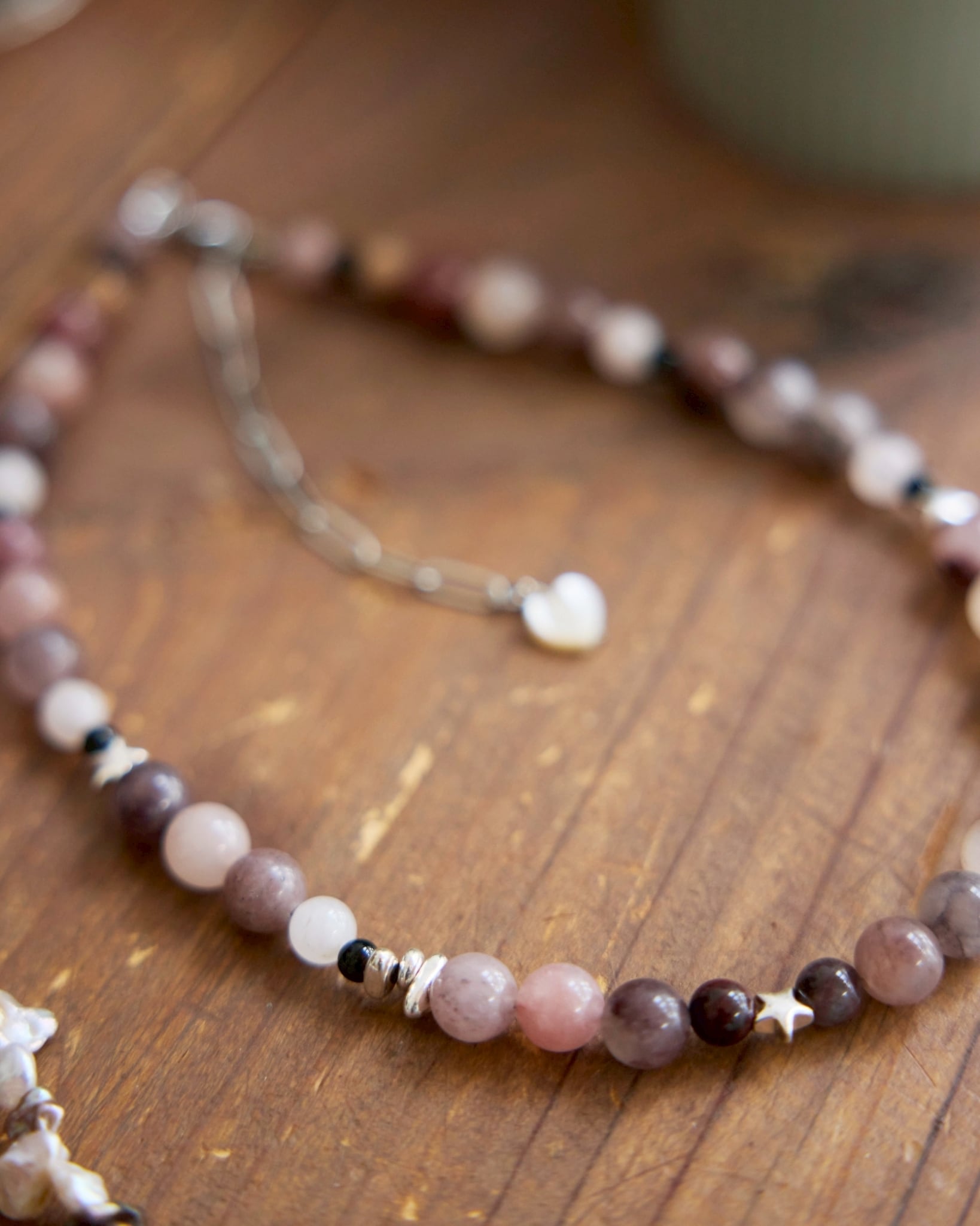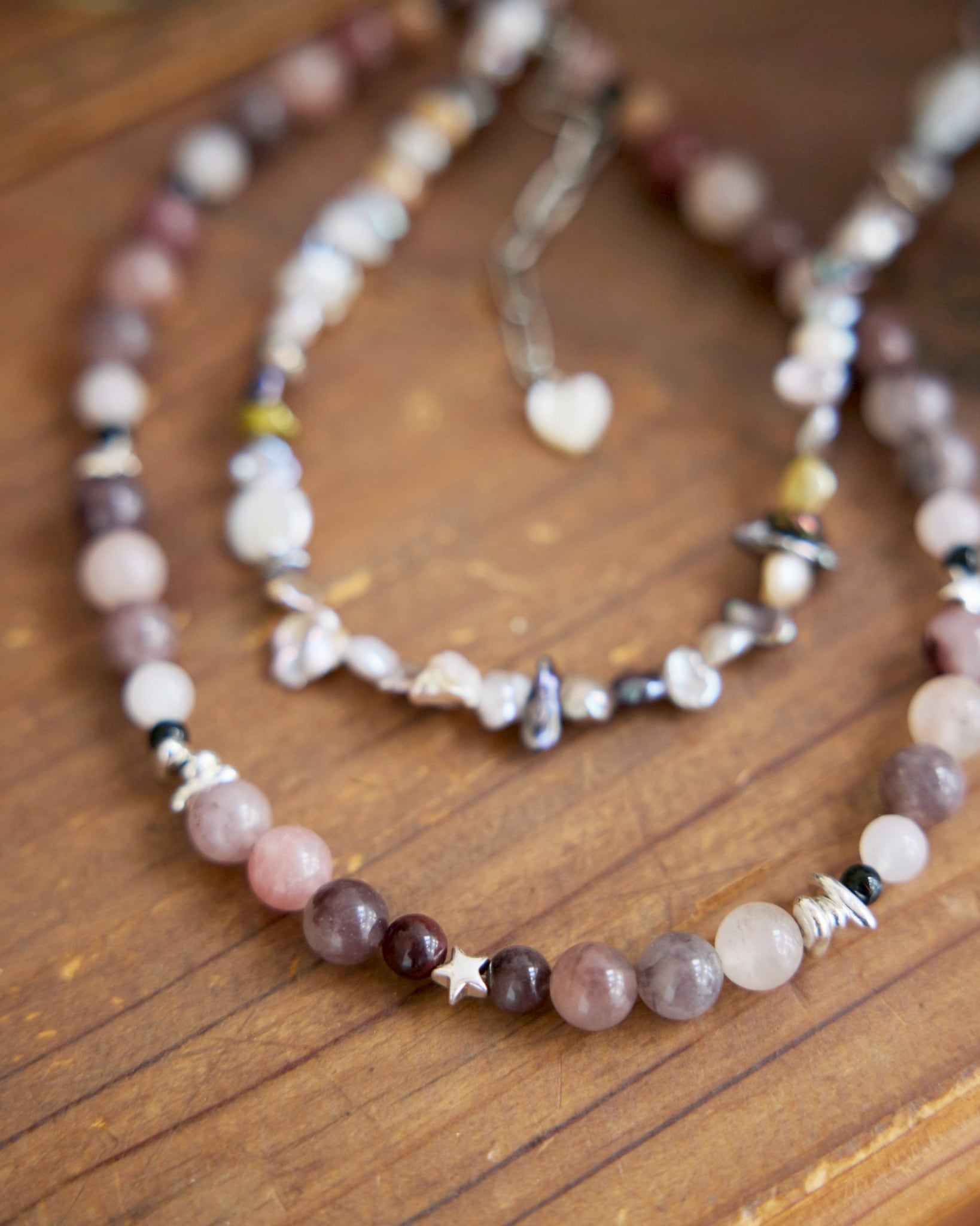 淡いニュアンスカラーのクォーツを、まるい形そのままに丁寧につないだ