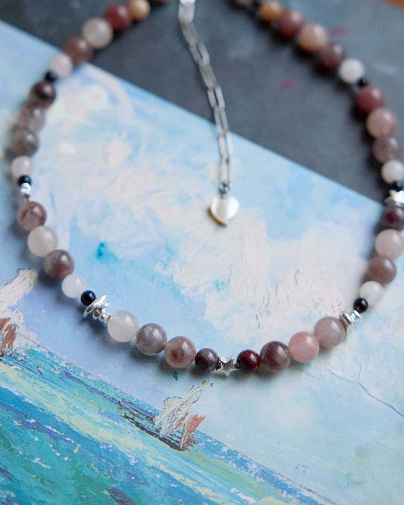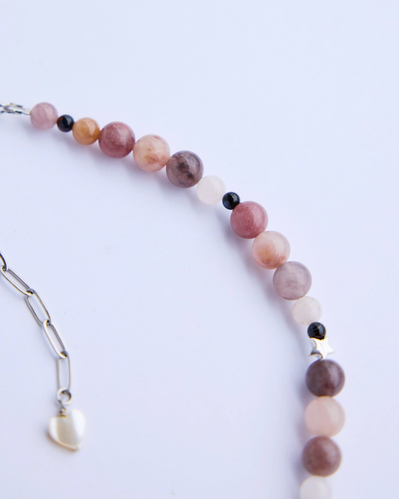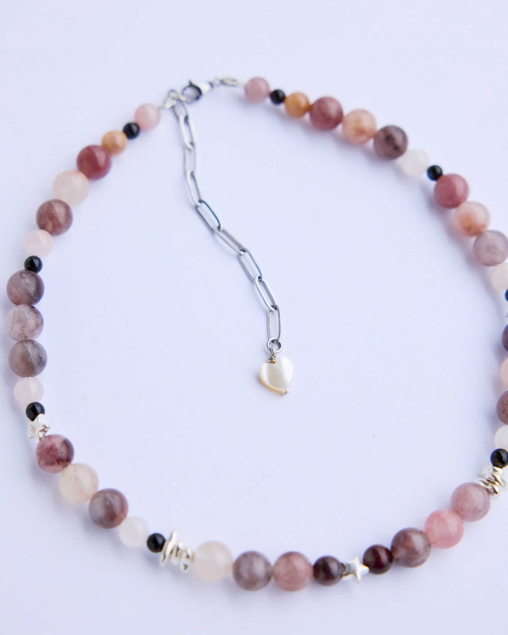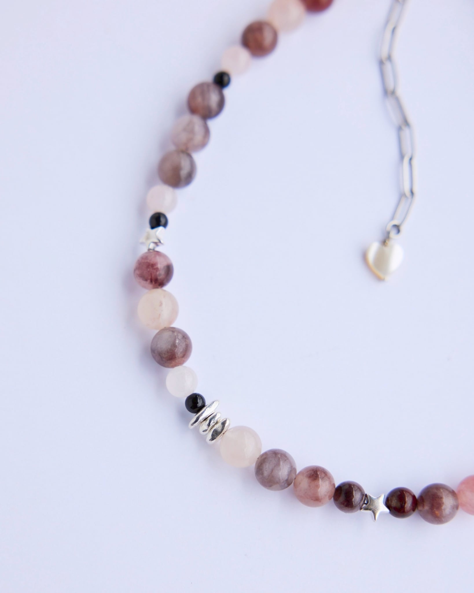 淡いニュアンスカラーのクォーツを、まるい形そのままに丁寧につないだ