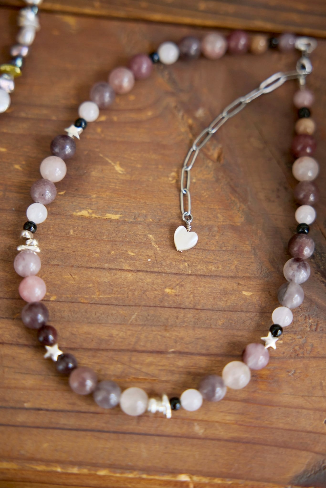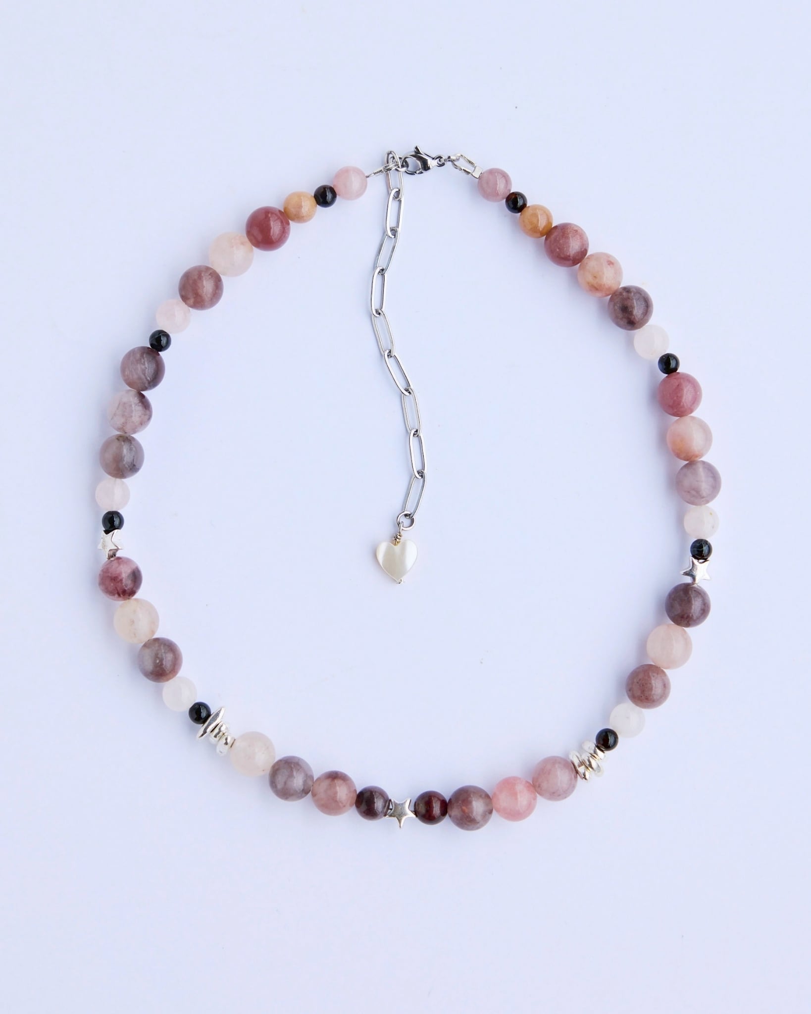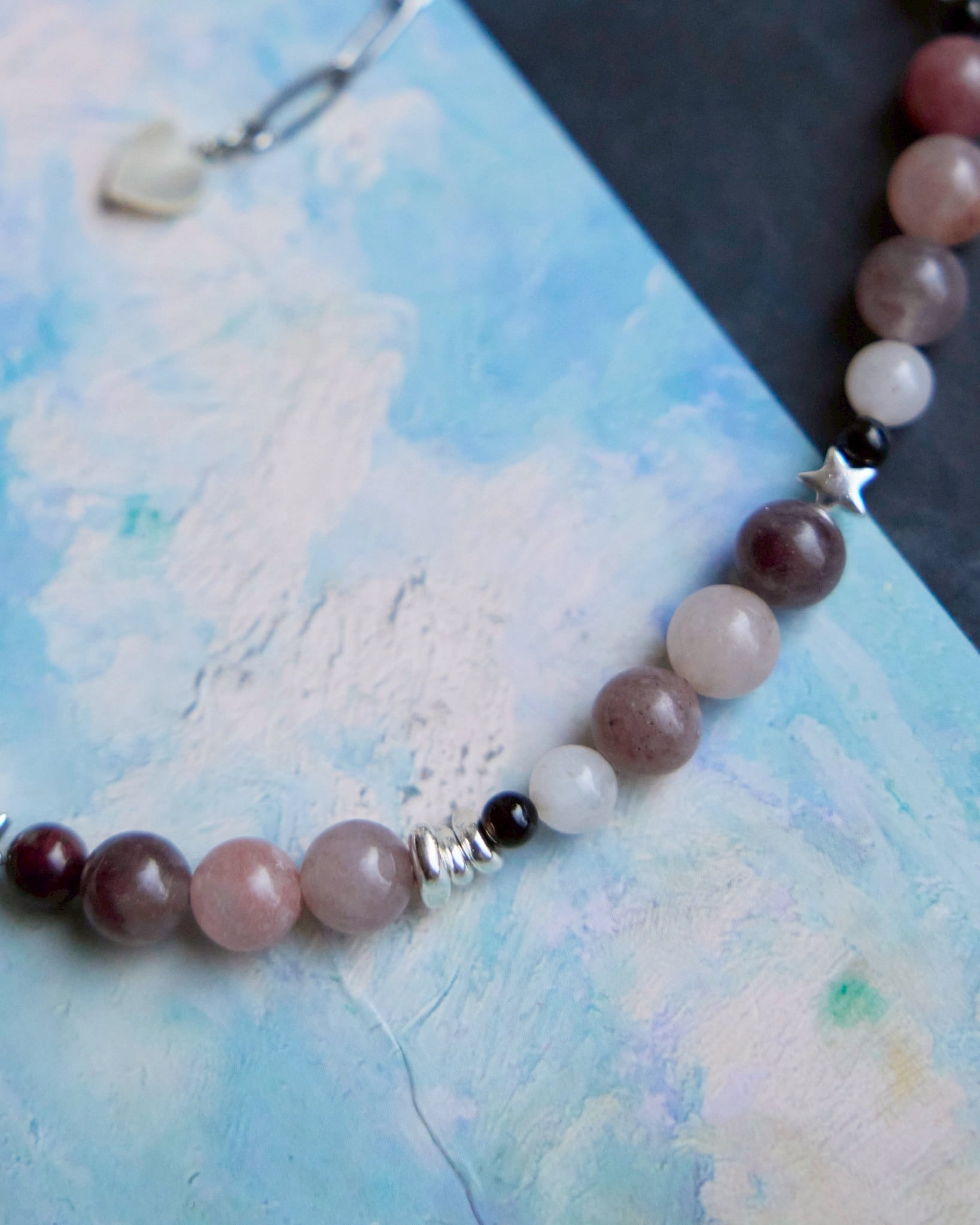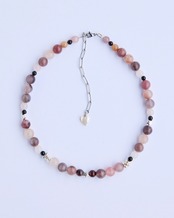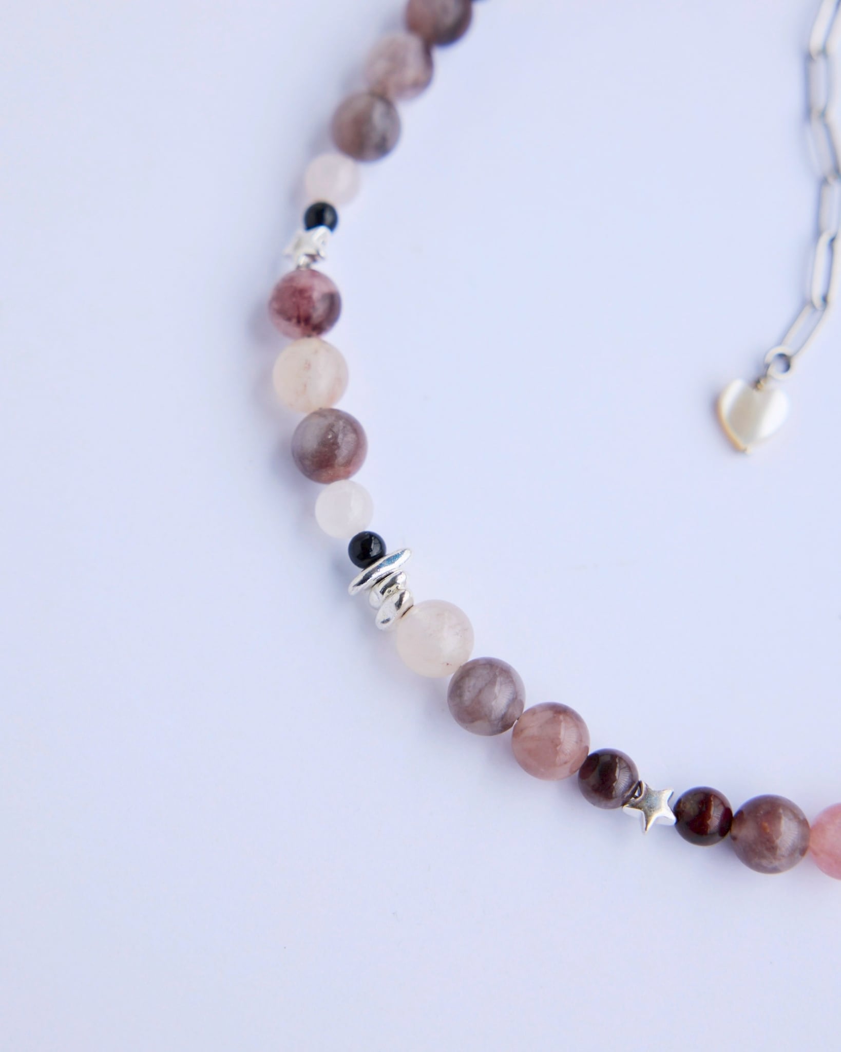 淡いニュアンスカラーのクォーツを、まるい形そのままに丁寧につないだ