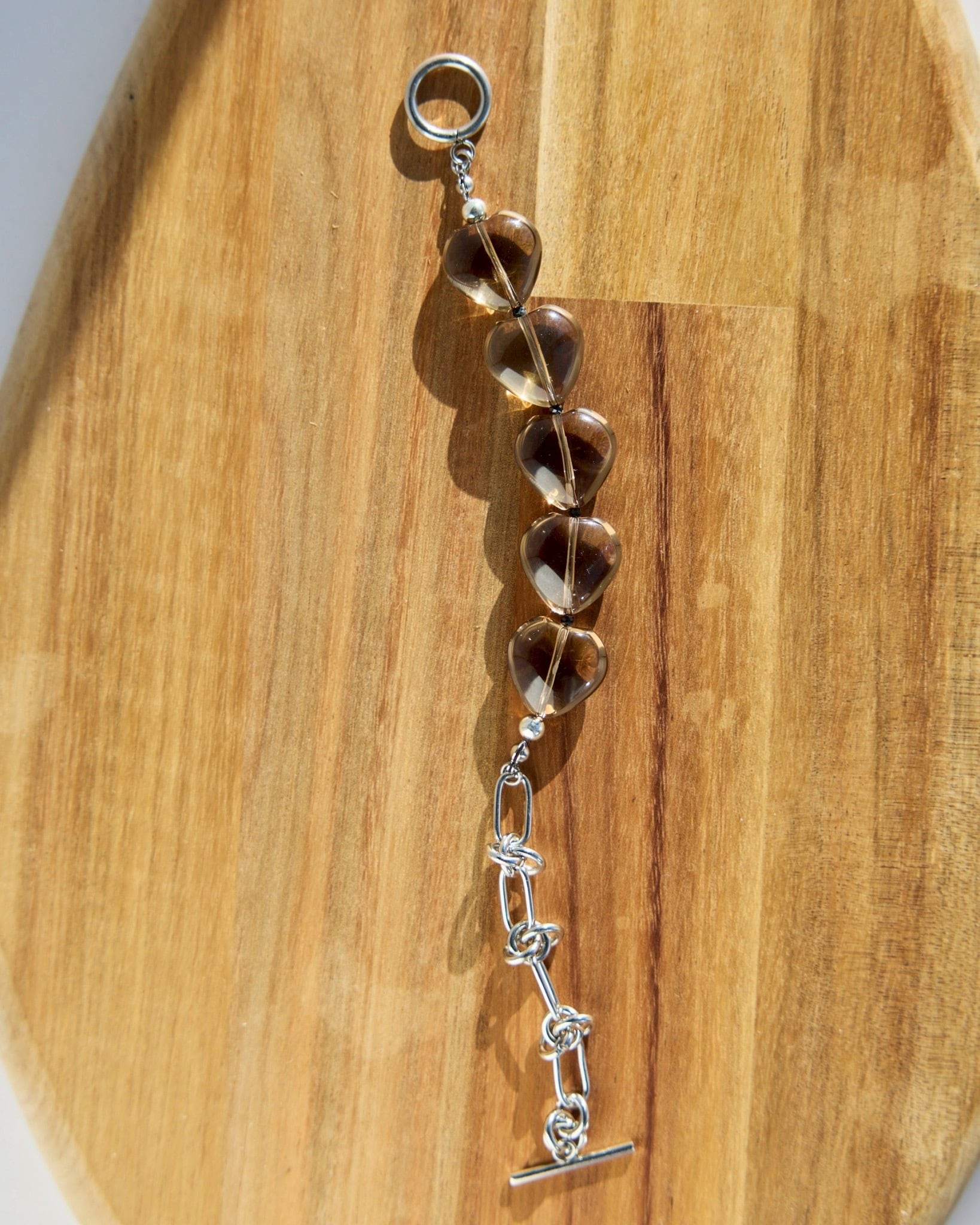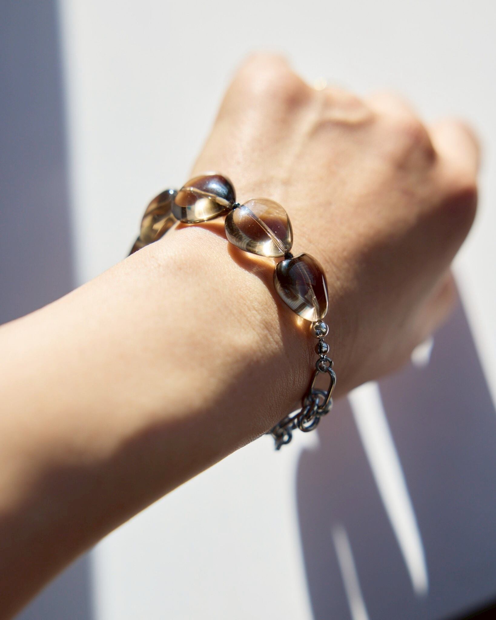 ぷっくりとしたハートのスモーキークォーツが連なる、