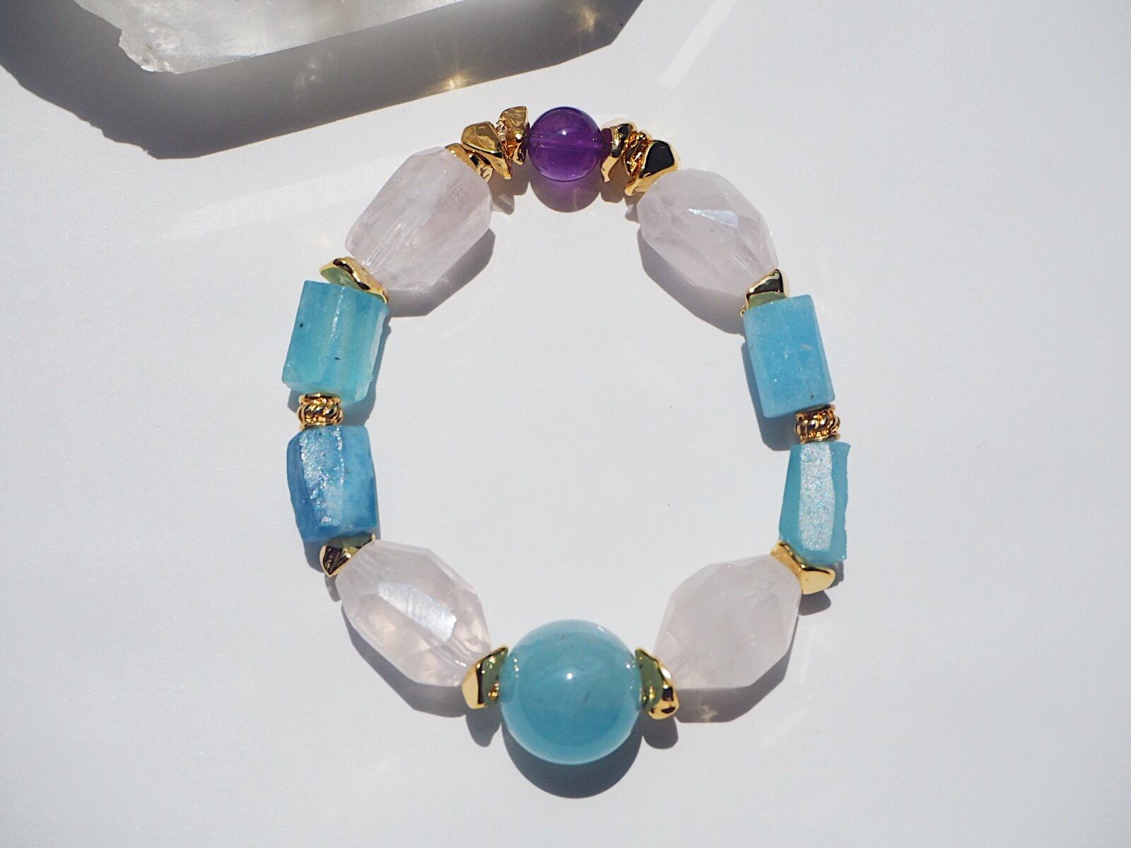 その花言葉、純真や無垢といったように透明感のあるカラーのストーンを選び甘さを控えた恋愛最強ブレスレット。