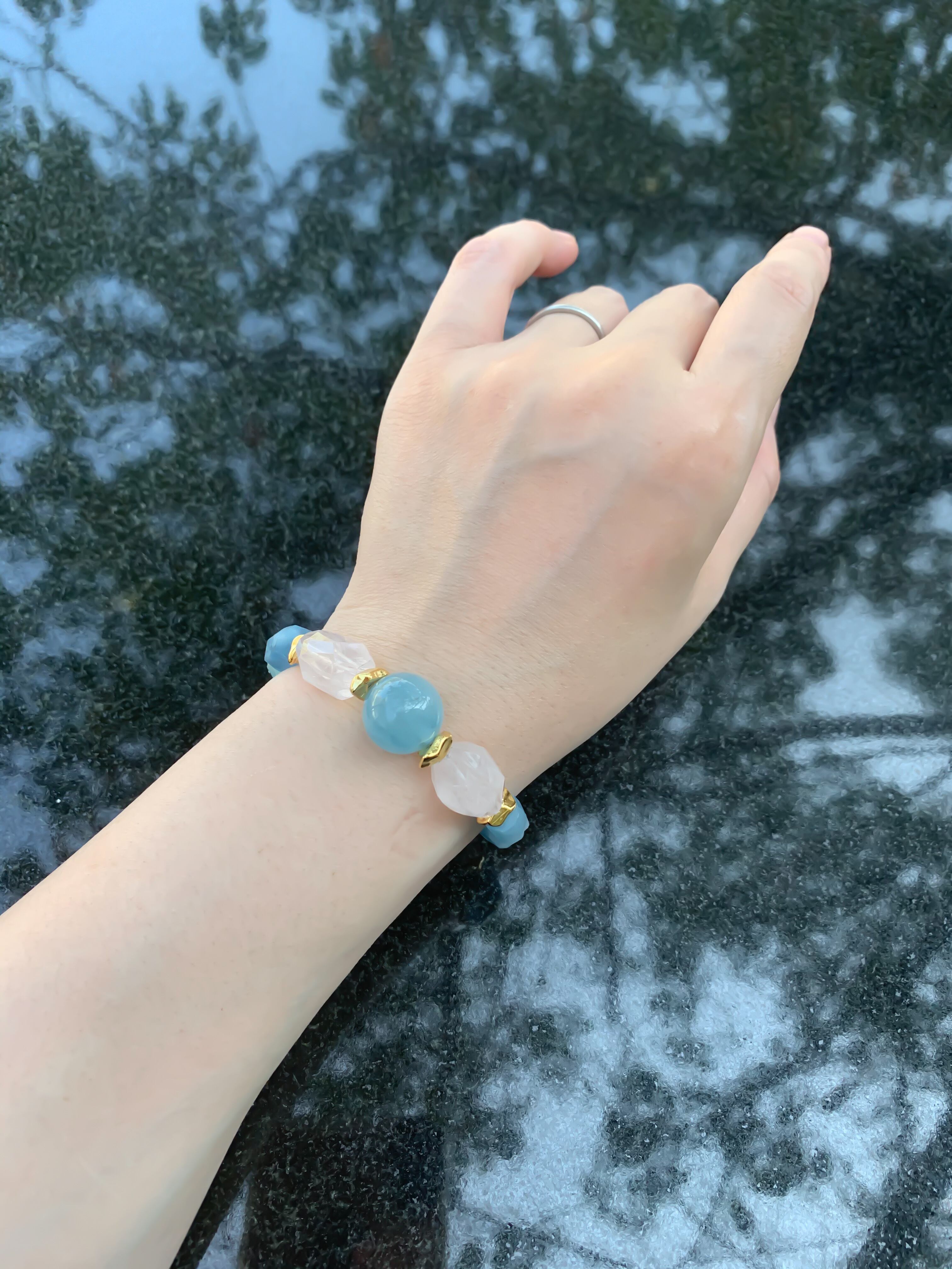 みずみずしい大玉のアクアマリンとローズクォーツが目を惹きます。