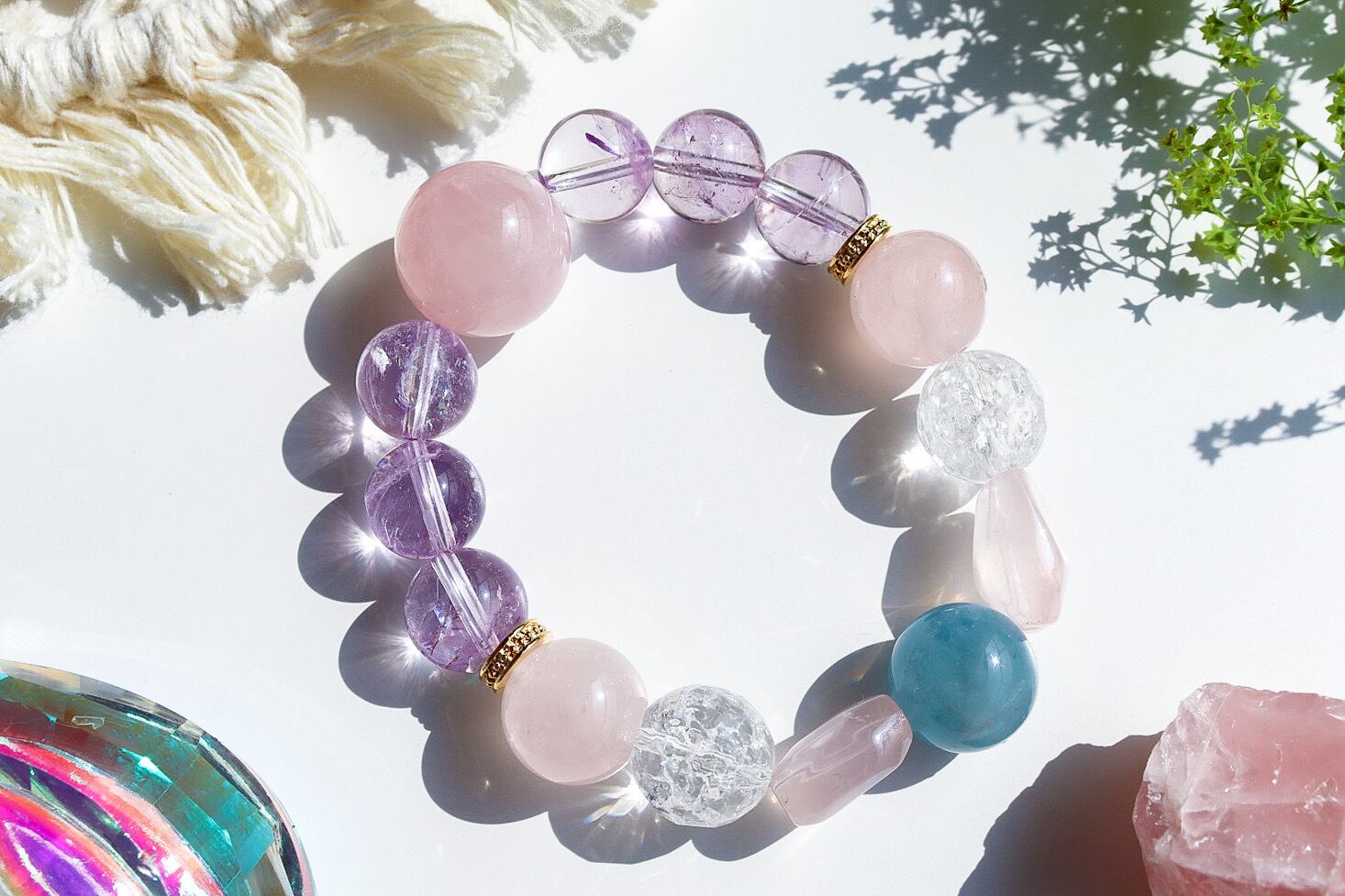 美しい大玉ローズクォーツを主役にかなり透明度の高いハイグレードのラベンダーアメジストを6個並べ(内包でレインボーが見えます)