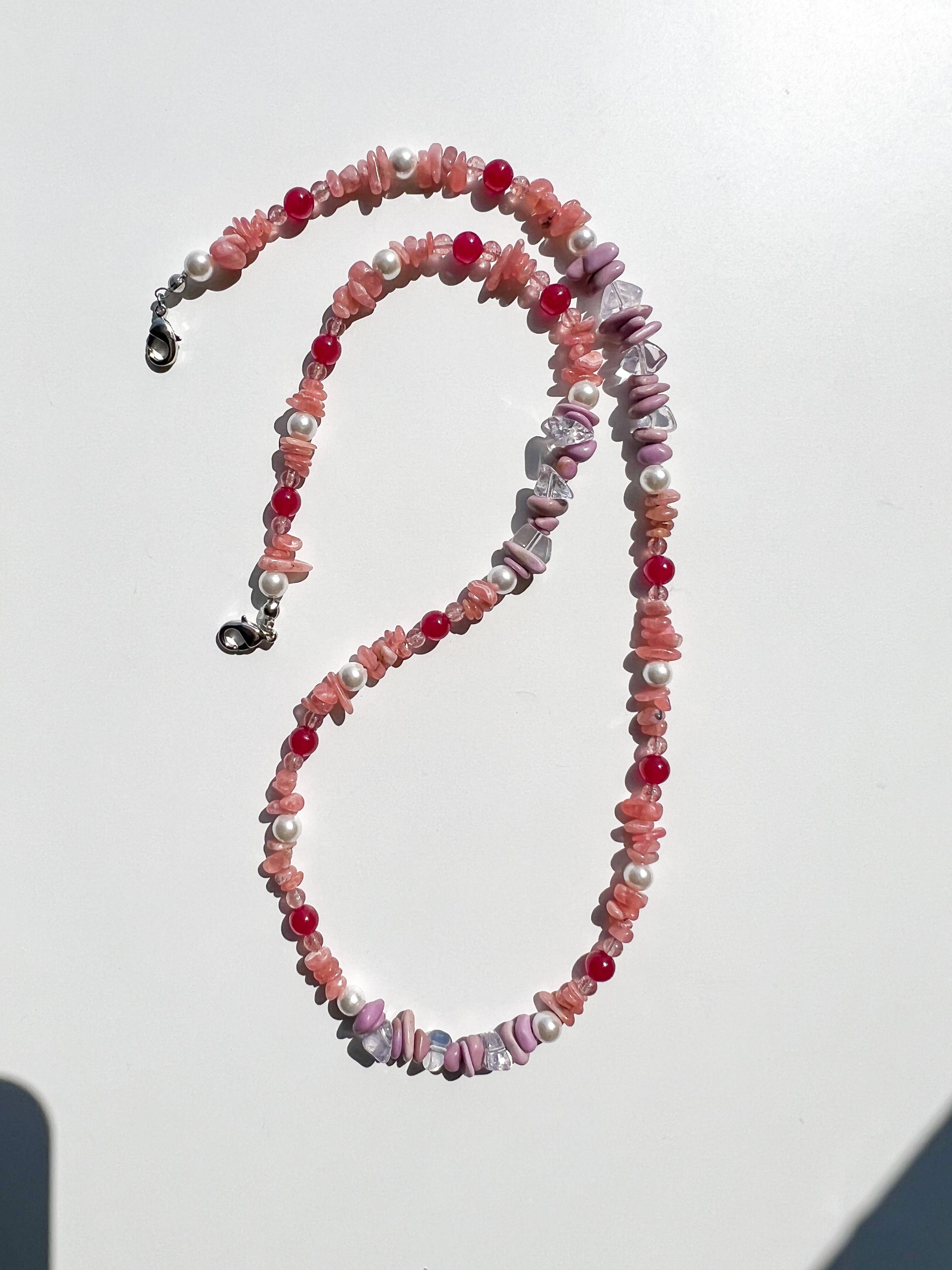 こちらのマスクストラップはハートを情熱的にしてくれる石として有名な「インカローズ」というピンク色が美しい天然石を中心にピンク色で統一して作りました。